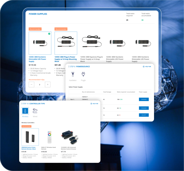 We developed a step-based custom solution using React JS and Adobe Commerce integration. This allows users to select their specific lighting needs step by step, ensuring accurate product recommendations tailored to their requirements. We utilized a headless approach to improve performance and maintain flexibility. With this solution, users navigate seamlessly through the process, receiving compatible products that match their unique configurations, enhancing the overall shopping experience.
