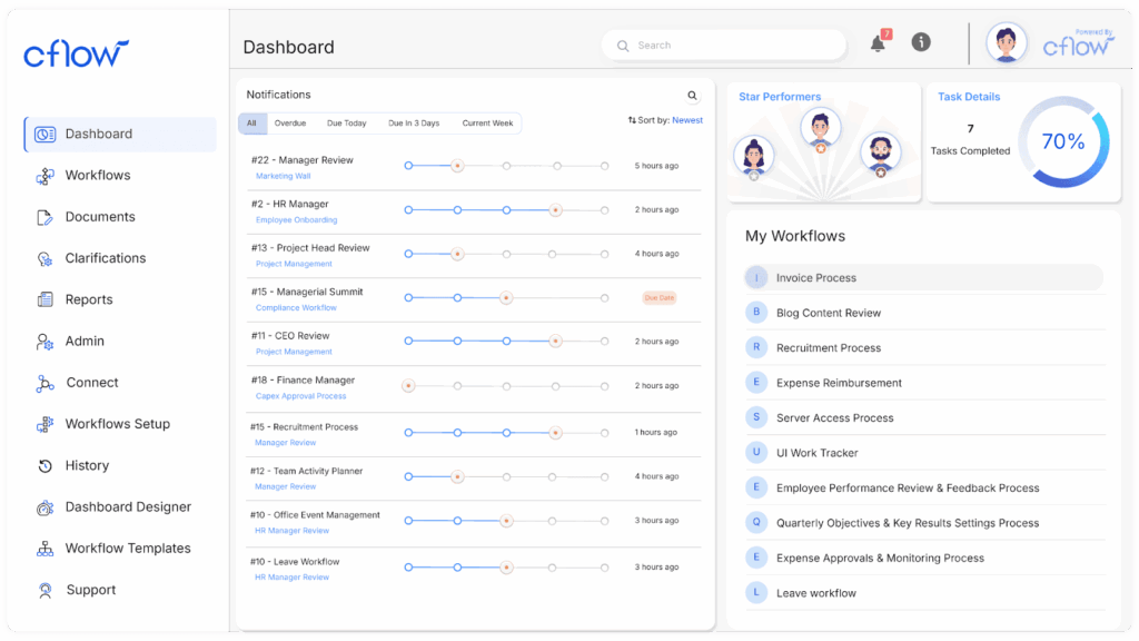 Cflow is a no-code workflow automation platform that helps businesses streamline processes without technical complexity. It enables teams to automate approvals, manage tasks, and eliminate repetitive manual work with ease. Designed for flexibility, Cflow adapts to diverse business needs, ensuring faster operations and improved compliance.
