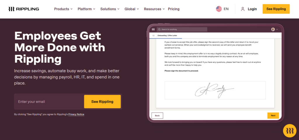 Rippling is an integrated HRMS that consolidates payroll, benefits, and employee management into a unified platform for businesses of all sizes.