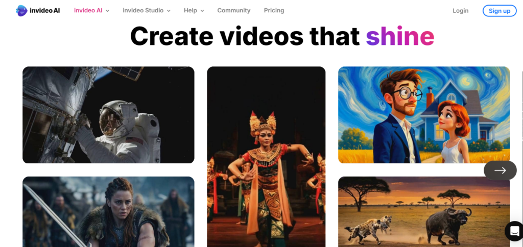 - Features: Pre-made templates, text-to-video conversion, stock video library, voiceover options.